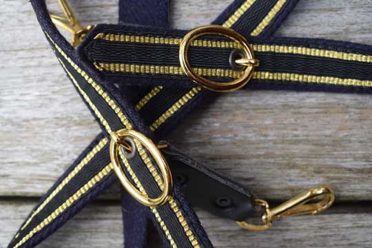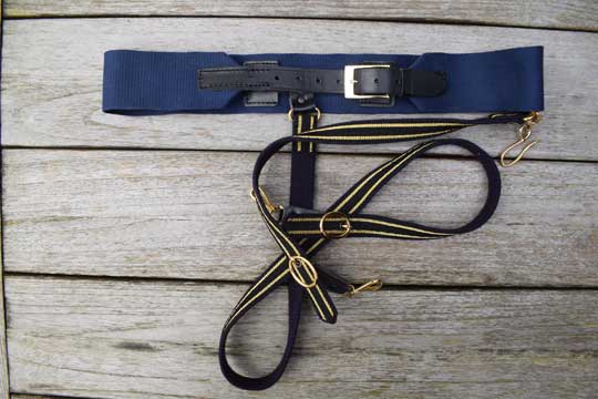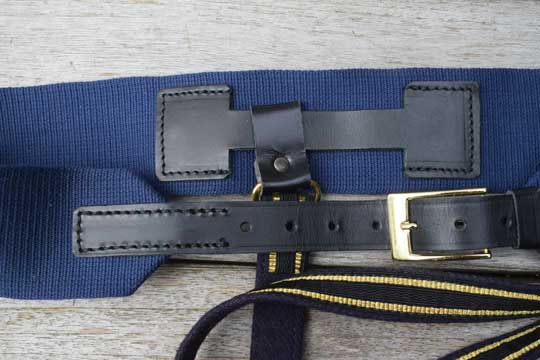 "Nederlandse Marine officiers sabelriem voor "onder de jas" / "Dutch naval officers sword belt, under coat model". Minty Navy blue fabric belt with black leather strap and plated buckle. 2 long black fabric straps with gilt borders, a gilt brass hanging hook and gilt brass buckles.