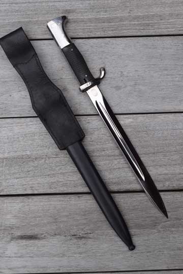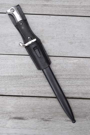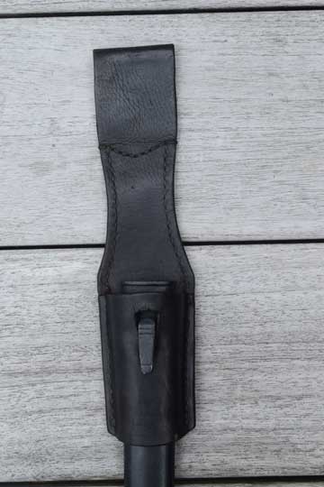 Comes with its genuine and rare polished dark brown/black flexible leather police bayonet frog as found. No rivets and all stitching intact. Excellent example described by Roy Williams new book: A collectors guide to German Bayonets frogs. Page 193 on the very right.