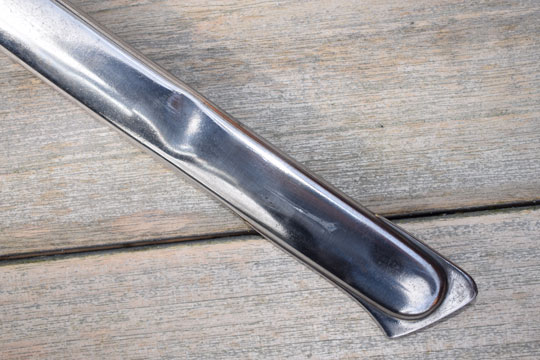 Excellent bright finished all steel scabbard with a single fixed saddle ring. There is a small single dent only, close to the scabbard drag.