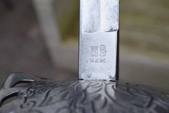 "Cavalerie Officierssabel M 1895", Lange sabel No.3./ Dutch Cavalry officers sword M 1895. "Long sword" No.3. Superb bright finished steel fullered curved long blade. The German makers trademark on the ricasso: Kings head and Knight helmet over W.K. & Co. (=Weyersberg & Kirschbaum- Solingen. Trade mark used from 1883 -1918) and a Dutch retailers name and residence on the left blade side: P. MANSVELT & ZOON. over 's GRAVENHAGE in a scroll on the left side of the blade. (= Pieter Mansvelt and Son, Denneweg 12, The Hague. 1799-1960). The right side is marked with the Dutch proof mark: YZERHOUWER in a scroll.
