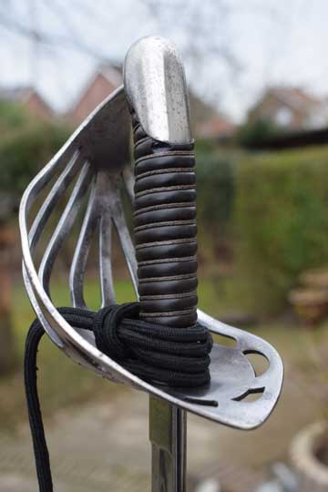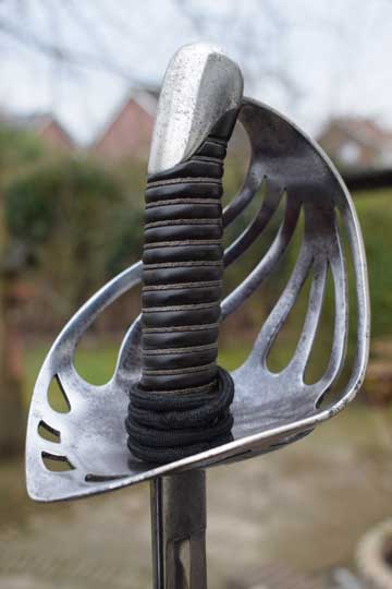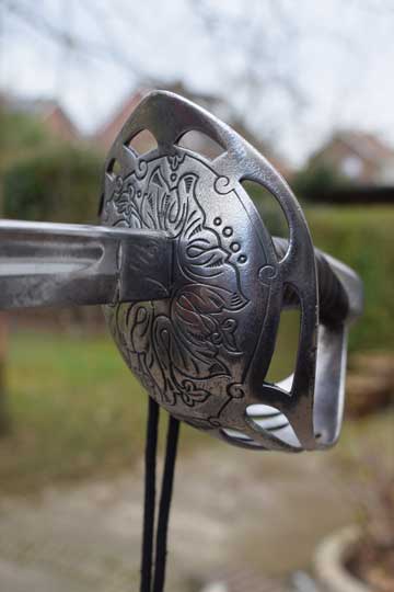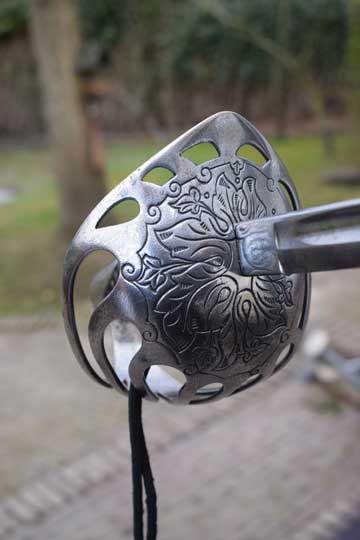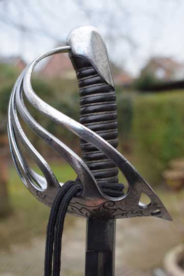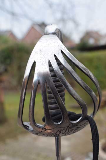 Excellent- large chromium plated pierced bowl hand guard with 7 bars showing light wear to the plating. Beautiful floral motives engraved to the outside of the guard. Excellent plated pommel. Detachable hilt with an Excellent ribbed black composite grip and an intact silver wire winding.