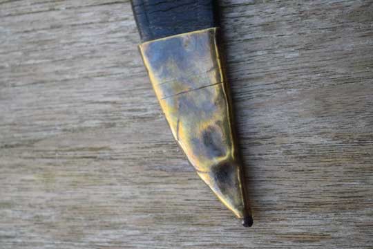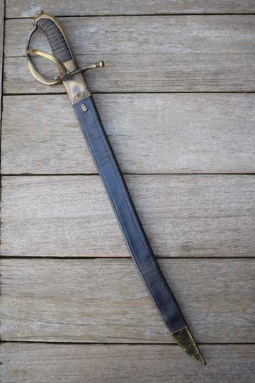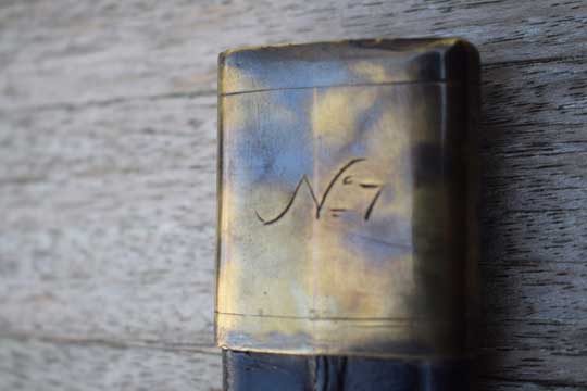 Comes with its Excellent- tooled black leather scabbard with brass mounts. There is a Block number: No. 7 on the top mount. All stitches intact and no serieus dents to the fittings.
