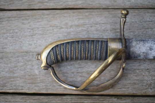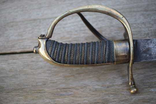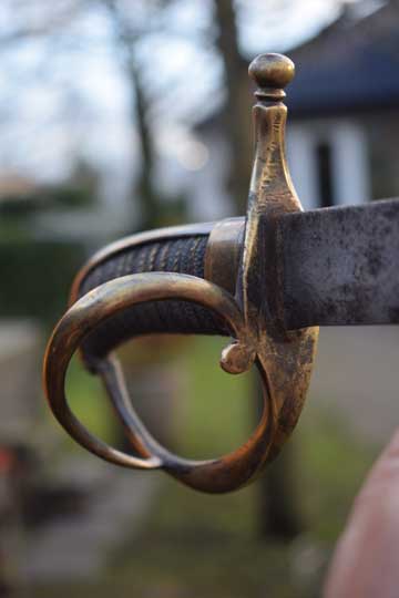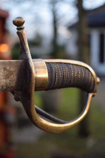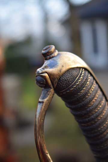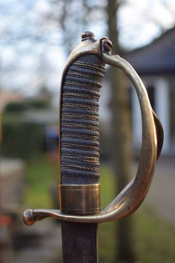 Very good+ bright finished plain blade. Blade shows user spurs and stains only. Washer intact. Excellent brass hilt with a single knuckle bowl and a side bar, screwed to the pommel of the hilt. Short straight qullion with round finial. Excellent+ wooden grip covered with shark skin and an intact and complex red copper wire winding.