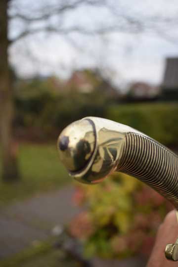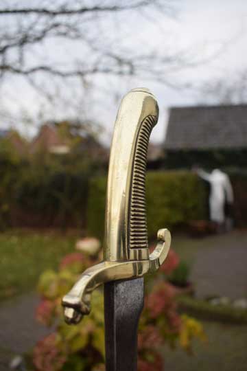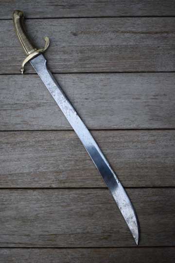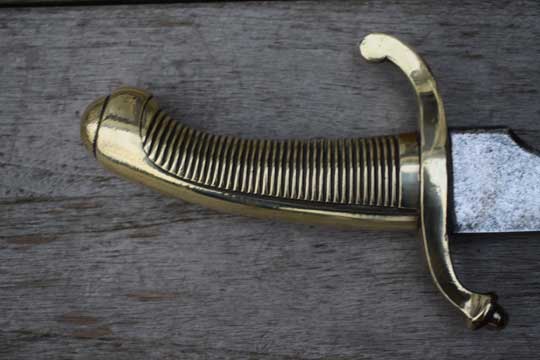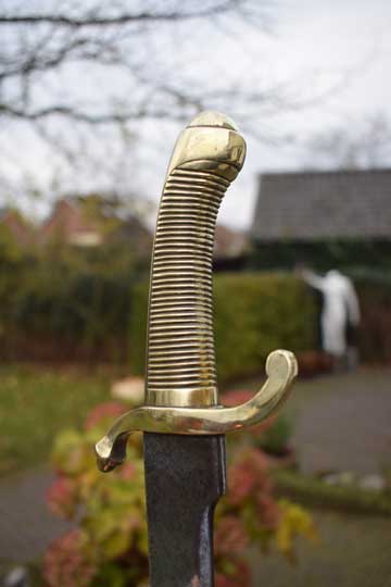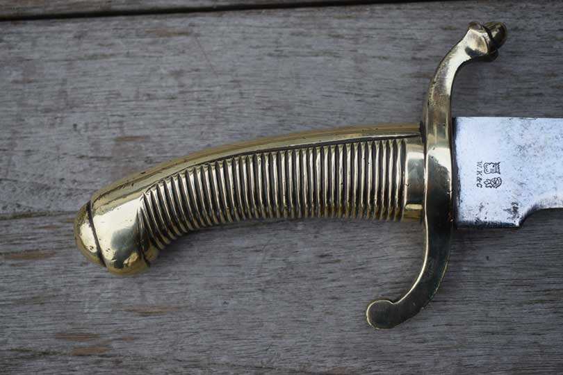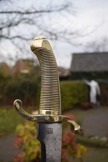 "Nederlands Infanterie Onderofficierssabel M 1859. Korte sabel No. 3." / Dutch Infantry NCO short sword M 1859, No.3. Excellent curved bright finished plain blade. German maker trademark: Kingshead and Knight helmet crisp over W.K.& C. on the ricasso. (= Weyersberg - Kirschbaum & Co.- Solingen). Excellent+ one piece cast brass hilt with a ribbed handle with no steel rivet in the center. Massive cast brass crossguard with a forward and a backward swept quillon. Forward swept quillon with an acorn.