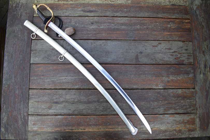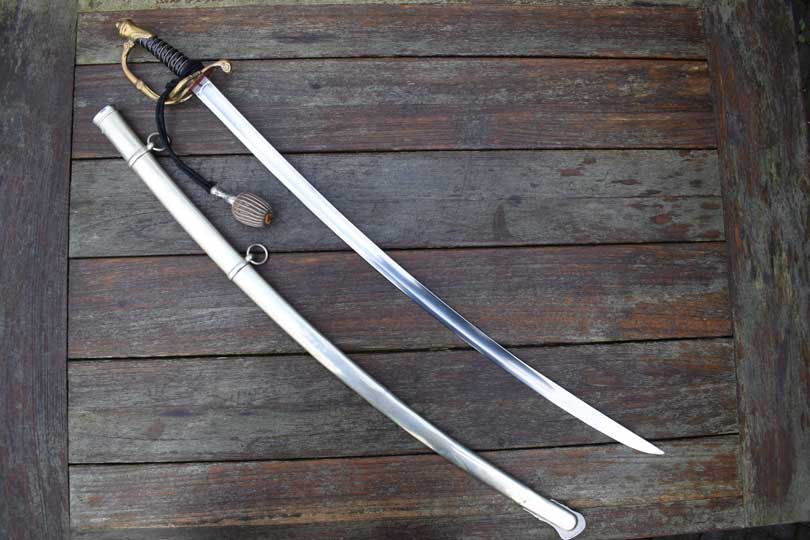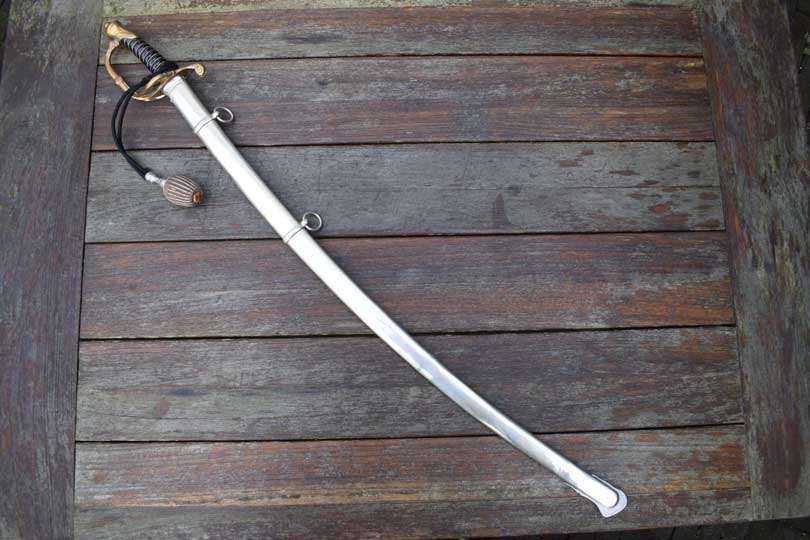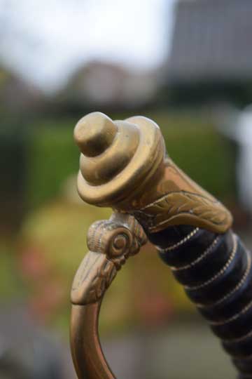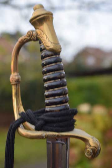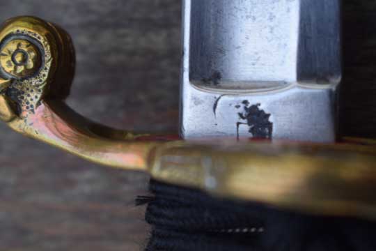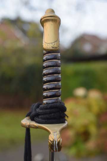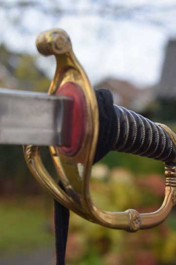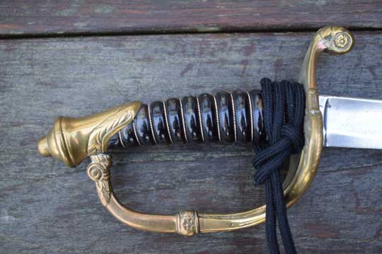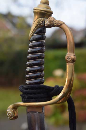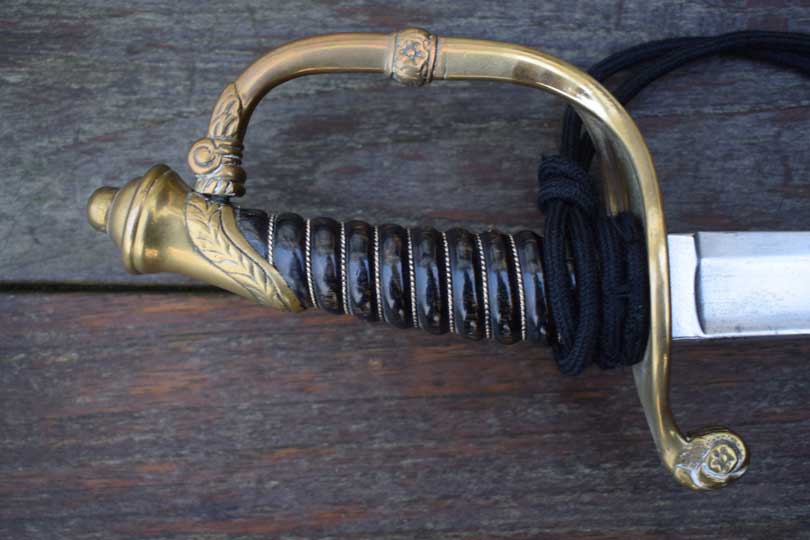 Excellent detachable M 1852 brass hilt with a cast brass pommel and an one piece black horn grip with an intact twisted silver wire winding. Brass hand guard with a single side bar. Crossguard with forward swept guillon.