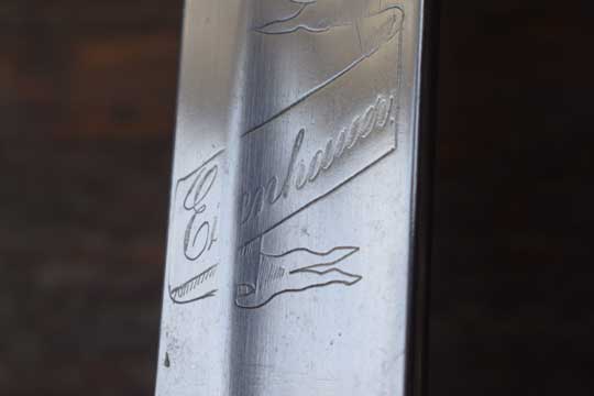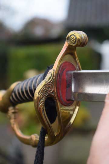 "Nederlands Infanterie officiers sabel M. 1852 " / Dutch Infantry officers sword M 1852. Superb heavy curved bright finished fullered blade. German makers trademark Z in a shield (=Clemen & Jung Solingen) on the ricasso and the Dutch retailers name and residence: P. MANSVELT & Zn. te 's Hage in a scroll on the left blade side (= Pieter Mansfelt and Son, Denneweg 12, The Hague. 1799-1960),. The reverse side is marked with the Dutch quality marking in an old style: EISENHAUER in a scroll (and not YZERHOUWER!). Red leather washer intact.