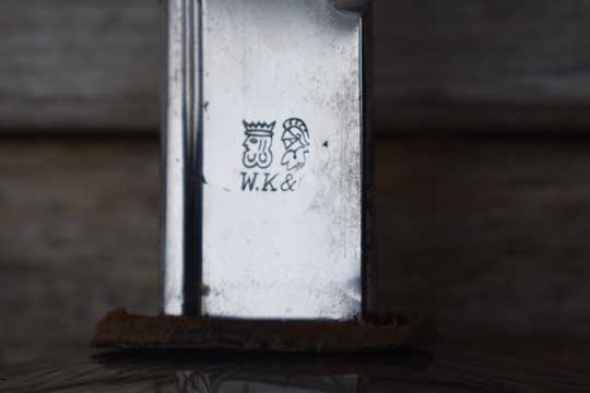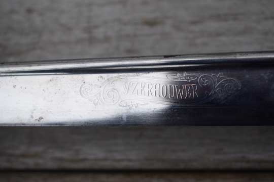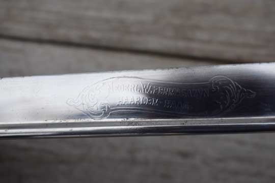 "Nederlands Infanterie Officierssabel M 1897"/ Dutch infantry officers sword M 1897. Fantastic long bright finished heavy straight quilback blade with the German maker's trademark: Knight helmet and crowned Kings head over W.K.& Co. (= WEYERSBERG and KIRSCHBAUM & Co- SOLINGEN. This trade mark was used from 1883 till 1918) on the ricasso. Crisp Dutch retailers name and residence: NEDERLANDS WAPENMAGAZIJN over HAARLEM-HAAG in a scroll on the blade and the Dutch proof mark: IJZERHOUWER in a scrol on the reverse side of the blade. Excellent+ bright polished steel pierced hand guard with 5 bars, engraved with flower motives. Not plated. Detachable hilt with an unusual brown bakelite ribbed grip with a finger rest. Intact silver wire winding. (Note: This grip looks a bit like the grip of a French contract made Chilean M1890 Cavalry officers sword, but this one has nine large ribs all the way up to the top of the grip and a silver wire winding and not 11 small ribs running til the beginning of the pommel, like the Chilean grip and it has no wire winding.)
