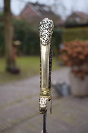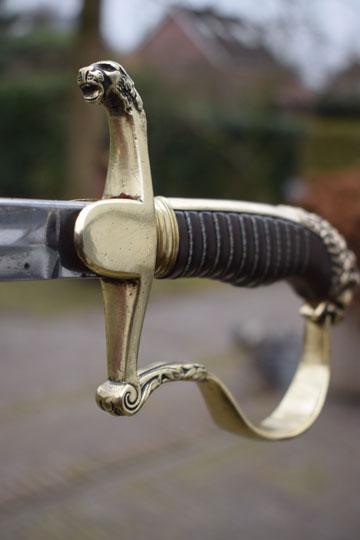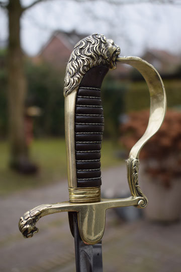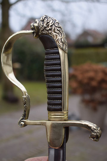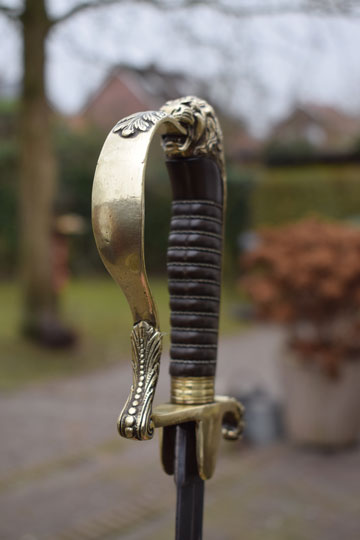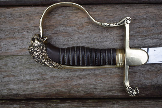 Excellent+ gilt brass hilt with a lion head and knuckle bow. Crossguard with forward swept quillon with puma head. Excellent dark brown ebony grip with an intact twisted brass wire winding.