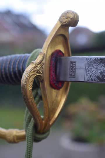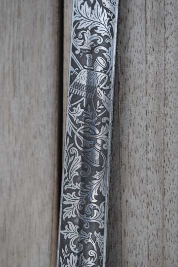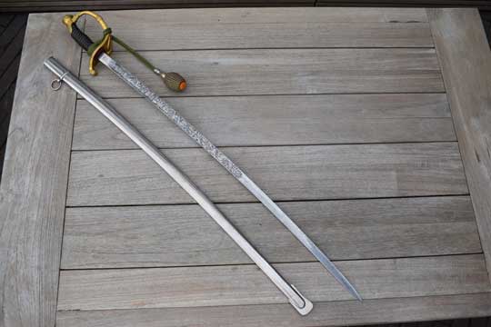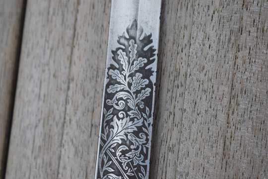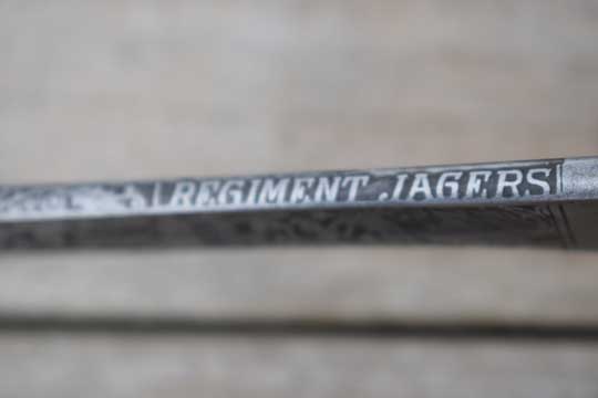 This sword is made around 1937. In 1913 the Regiments Grenadiers and Jagers were split. After 1913 the blades were marked: Regiment Jagers or Regiment Grenadiers.