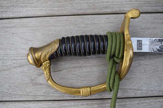 Excellent cast gilt brass hilt with a flat pommel (No nut on top like the Dutch Infantry M 1852 officers sword). Excellent one piece black ribbed horn grip with an intact gilt wire winding. Superb gilt brass straight hand guard with a small side bar. Crossguard with forward swept guillon.