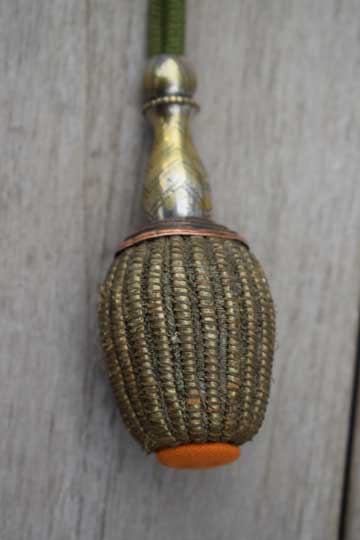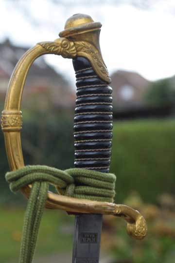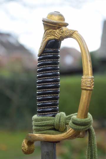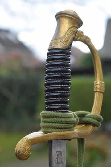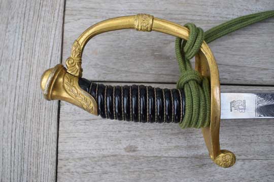 It comes with its genuine and Excellent silver wire sword knot with the rare green Jaeger Guard cord and an orange core.