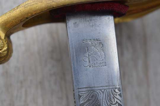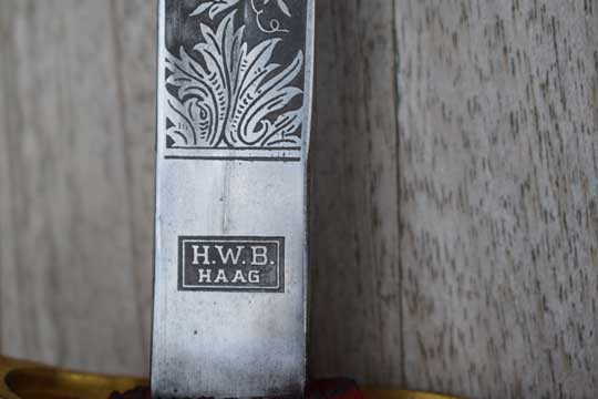 "Garde Jager officier's sabel M 1852"./ Dutch Jaeger Guard officers sword M 1852. Minty curved fullered bright blade with a beautiful deep etching on both sides. German makers trade mark: ORIGINAL over a Sitting Squirrel with a sword over EICKHORN-SOLINGEN (= Carl Eickhorn - Solingen. This trademark was used from 1935 till 1941) on the ricasso and a rare Dutch retailers name and residence in in a box on the right blade side: H.W.B. over HAAG (= H.W. Blomjous -The Hague) Intact red felt washer.