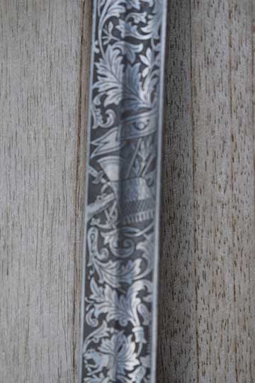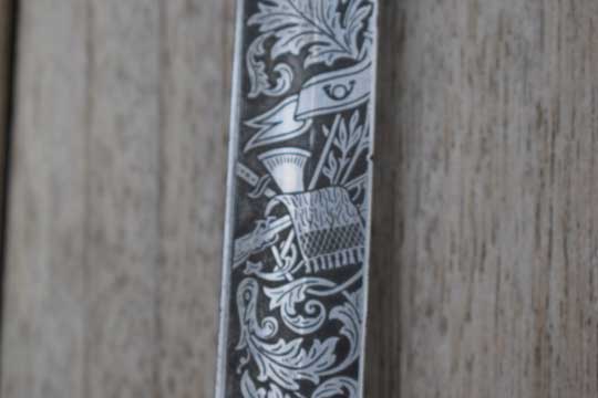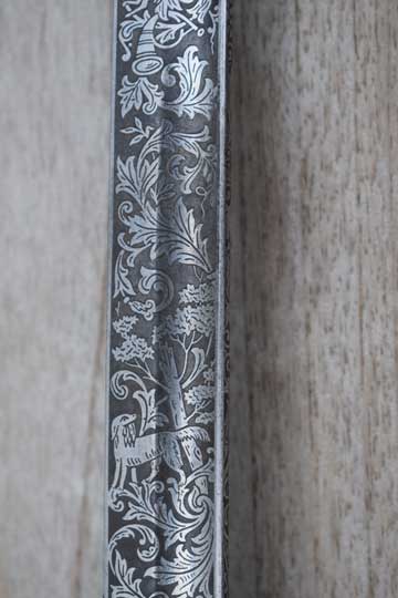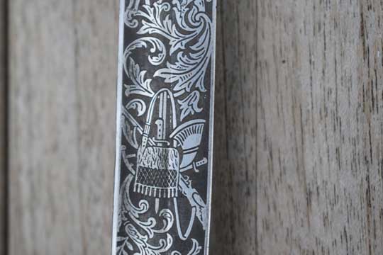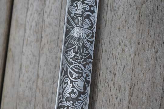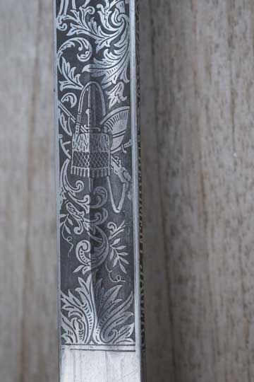 Blade is beautiful and deep etched on both sides with hunter's trophies, hunting rifles, hunting horns, gun dogs and follicants. Blade spine is completely etched and nicely deep etched named: REGIMENT JAGERS .