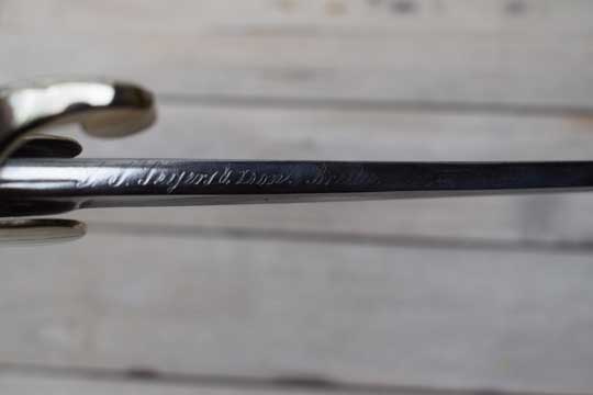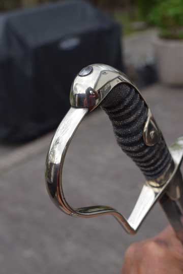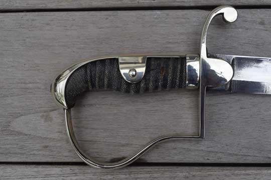 Excellent+ bright finished Berlin-Silver hilt with a stirrup hand guard and a forward swept quillon. Excellent ribbed wooden grip, covered with ray skin, missing the silver wire winding only.
