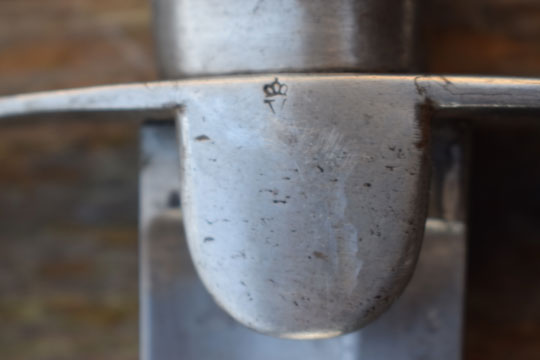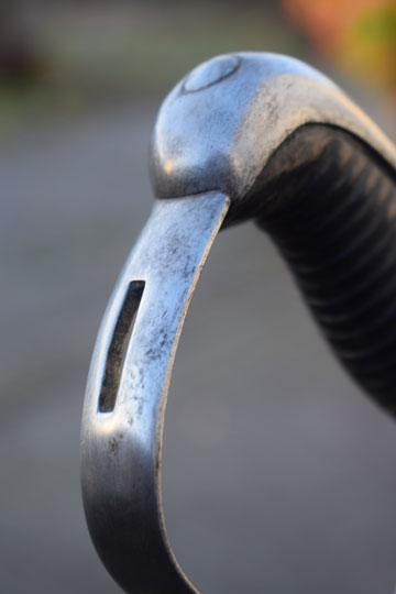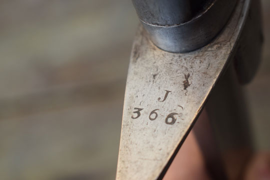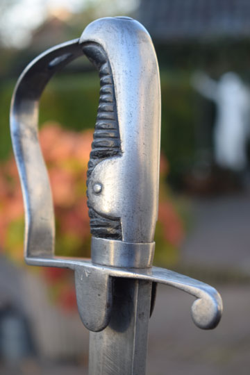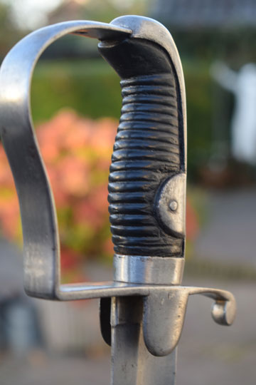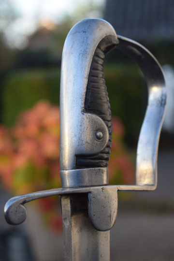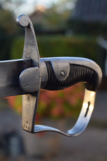 Excellent bright finished steel hilt with stirrup hand guard and forward swept quillon. Quillon is marked with a matching unit number: J over 360 (= Regiment: Mounted Jaeger= Regiment: Jagers te Paard) and a Dutch inspection marking: Crown over V on the left lanquet. Excellent ribbed wooden grip covered with black horse leather. The horse leather shows light wear only, but is intact. The back of the hilt shows a rack number: N over 380.