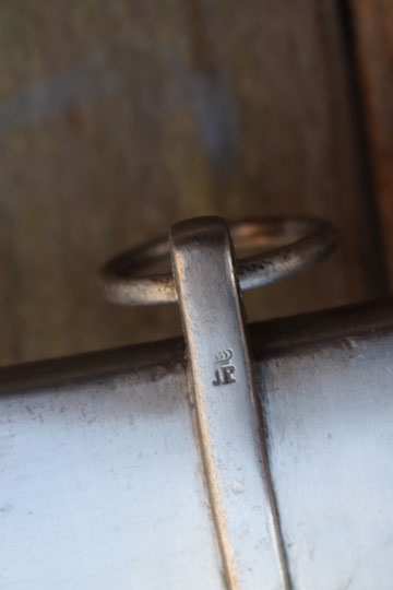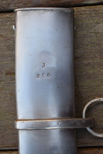 Excellent all steel scabbard matching unit marked: J over 360 and two loose hanging rings. No dents. Upper ring band is Dutch marked: Crown over JP