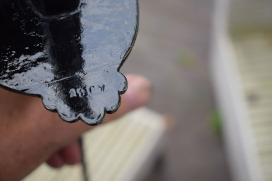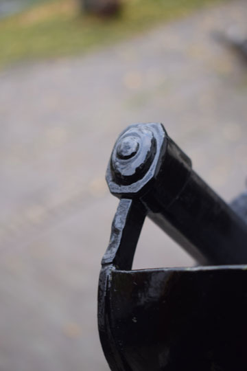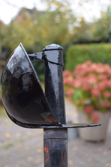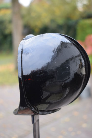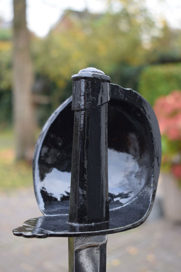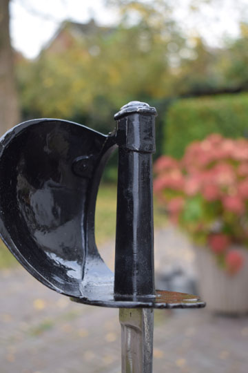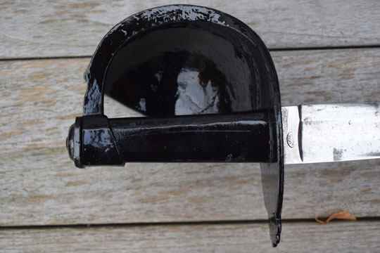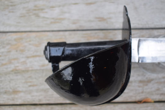 Excellent + all glossy black painted massive steel hilt with a large black painted bowl and with a straight lobbed "quillon". The inside of the quillon is marked with a rack number: 1907. (Not a date!)