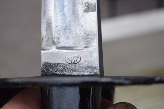 "Nederlands Scheepssabel No.1 M1818 " / Dutch Naval boarding cutlass No.1 M1818 Excellent+ bright finished fullered cutlass blade with the Dutch makers name and residence: J. F. J. BAR over DELFT (= Holland) in an oval crisp on the ricasso. On the reverse side there is a Dutch inspection marking: Crown over G. Both sides of the blade are faint etched with a large Navy anchor.