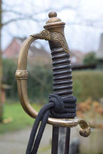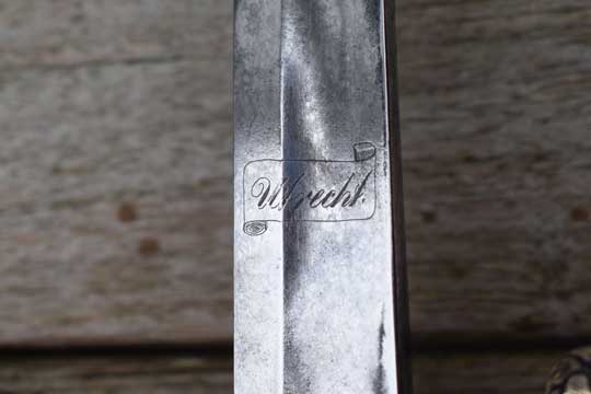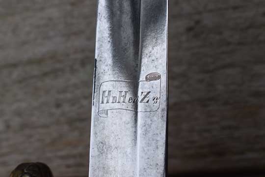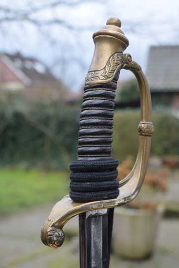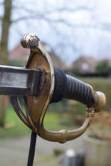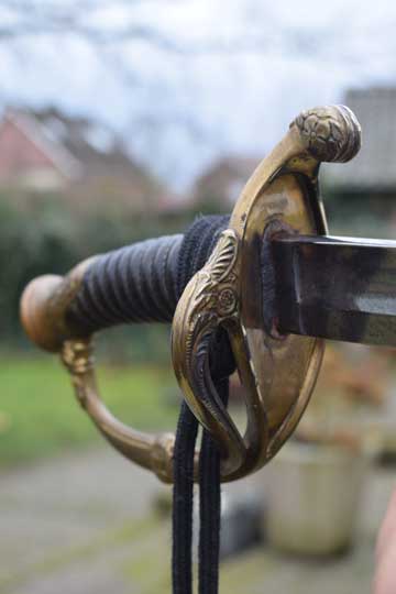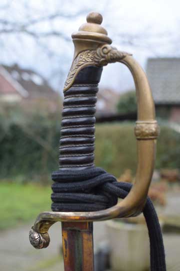 "Nederlands Infanterie officiers sabel M. 1852 " / Dutch Infantry officers sword M 1852. Excellent bright finished curved fullered wide blade with Dutch retailer trademark: H d H en Zn (= Hendricus de Heus & Zoon - 1832-1868. ) in a scroll on the left side and its residence: Utrecht in a scroll on the right side of the blade. Intact red cotton washer.