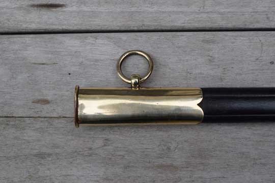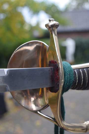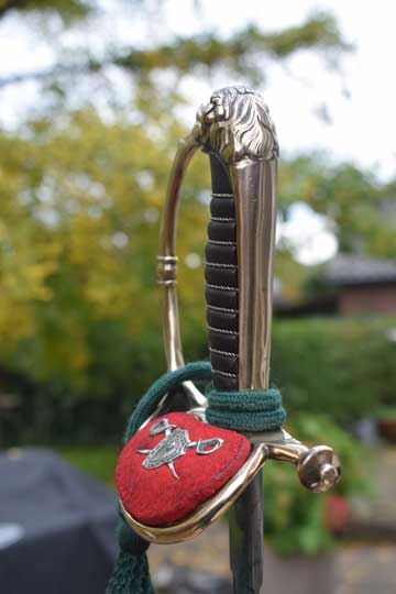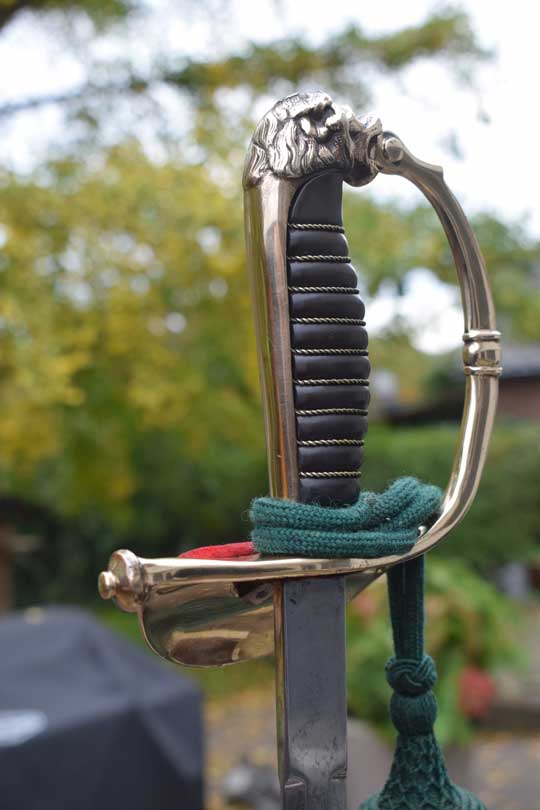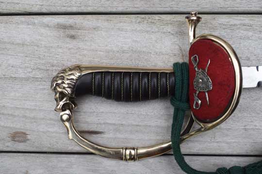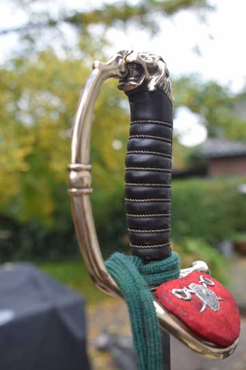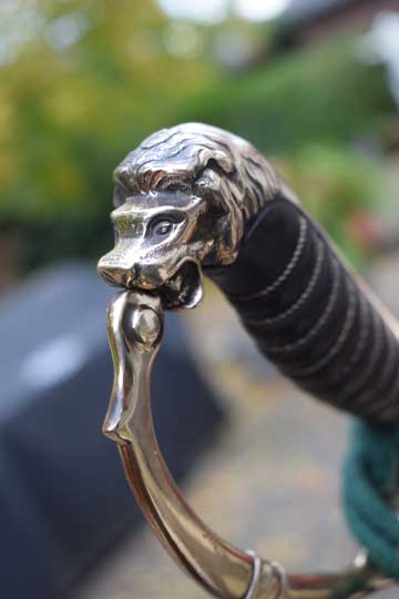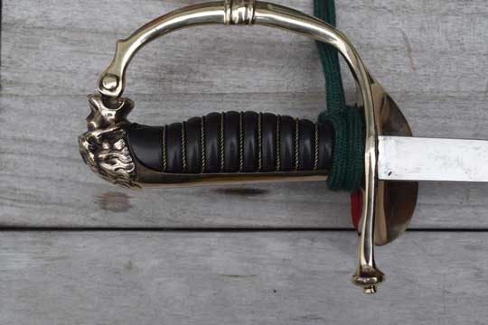 Excellent gilt brass lion head pommel and a single hand guard. Gilt brass crossguard with a straight quillon with an acorn final. Gilt brass clam shell with a silver emblem laid over a red felt showing a shield with two crossed sabres only and no laurel wreath!. Dark brown horn grip. Excellent silver wire winding.
