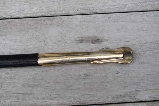 Excellent black leather scabbard with clear tooling and a brass chape and top mount with one loose hanging ring. All stitches intact and no dents to the mounts.