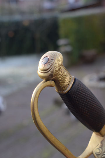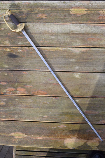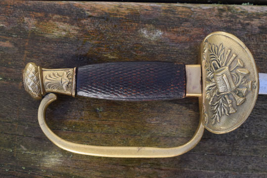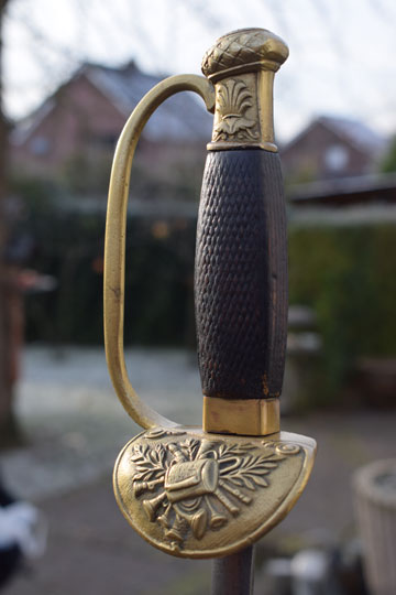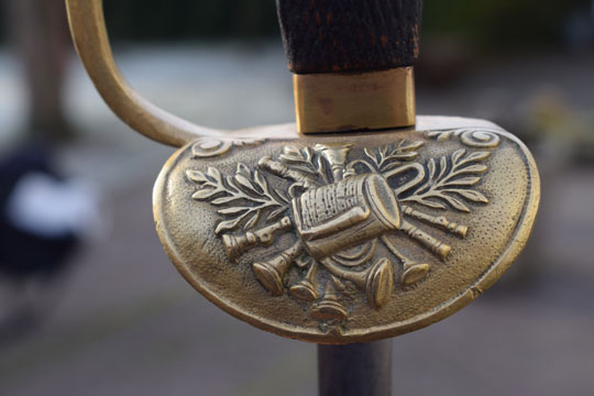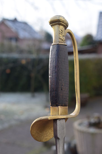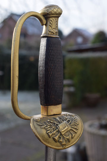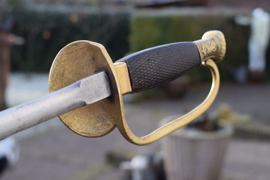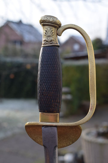 "Nederlands Militaire Muzikanten degen, rond 1815" / "Dutch Military Bandsman sword, Around 1815". Very good bright finished double edged plain blade. Excellent brass hilt with a clam shell guard, decorated with drums, trumpets, bugel horns, flutes and other instruments. Pommel with Royal feathers on both sides. Crossguard with a single hand guard. Quillon removed. Excellent one piece checkered wooden grip.