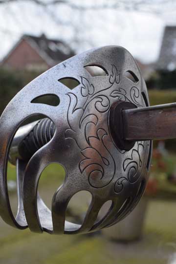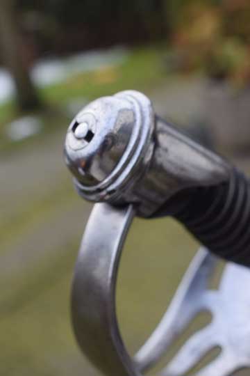 "Nederlands bereden Trein officiers - / bereden Artillerie officiers sabel M 1895, Lange (Pook-) sabel No.4. Pallasch type."/ Dutch Mounted Train officers sword/ Mounted Artillery officers sword M 1895 Pallasch type. No.4. Excellent- bright finished straight Pallasch type T- form blade with the Dutch retailers name and residence; FRANS POUWELS- 's GRAVENHAGE crisp on the blade spine. There are a few small patches with very light pitting to the blade only. Leather washer intact. Very heavy detachable straight bright finished steel hilt with a flower motives engraved pierced solid bowl guard with 7 side bars. Round ribbed hard black rubber grip, complete with an intact silver wire winding.