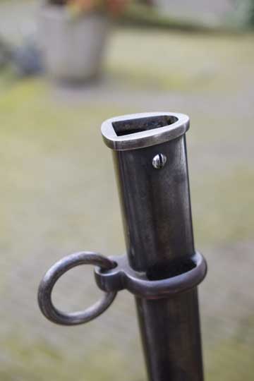 Excellent + V-shaped steel scabbard with one loose hanging ring and no dents.
