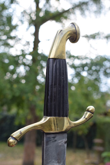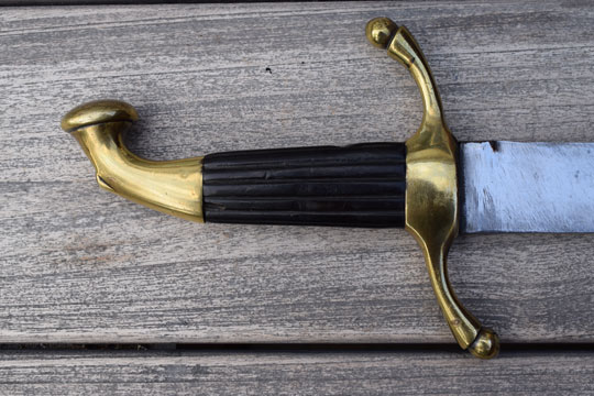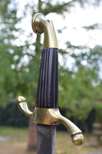 Nederlands / Belgisch "Veldwachterssabel, rond 1830". / Dutch / Belgian municipal constable short sword. Around 1830. No serial number. Very good bright finished straight plain blade with long false edge and no markings. Sharp tip and leather washer intact. Blade shows fine scratches. Excellent and massive one piece ebony grip with five ribs. Brass French style brass pommel and brass crossguard with a swept forwards quillon and a backward swept quillon with ball finials.