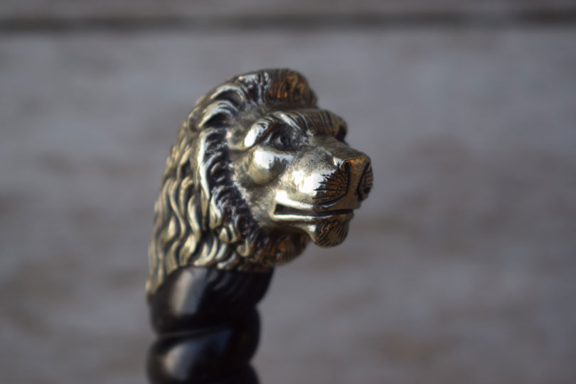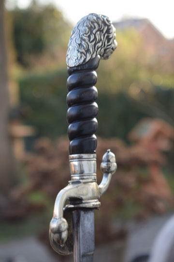 "Rijks Veldwachterssabel" 1880 - 1920. / Dutch State Rural Constable short sword M 1880. Excellent straight bright finished plain blade with the Dutch retailers name and residence on very crisp the left side of the blade in a scroll J.F. SEGERS & ZOON - BREDA and IJZERHOUWER. Beautiful and massive cast Berlin-Silver lion head pommel with one piece ribbed black horn grip with 7 ribs. Excellent Berlin-Silver crossguard with two opposite quillons with acorn finals. Excellent Berlin-Silver shell guard showing a hunters horn.