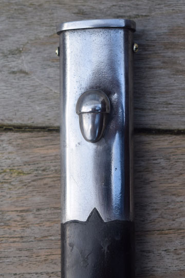 Excellent+ and rare and very well made out of one piece and glossy black painted steel scabbard with imitated bright polished mount parts and no dents. Top mount with an acorn shaped frog stud and brass throat retaining screws.