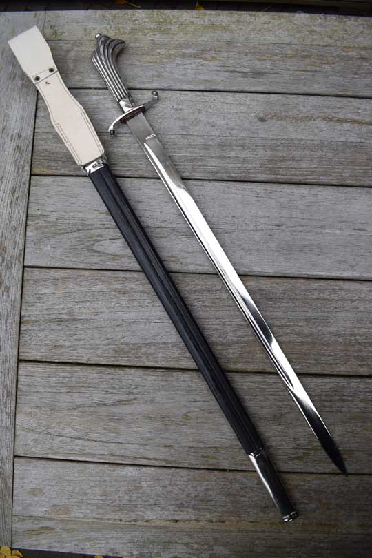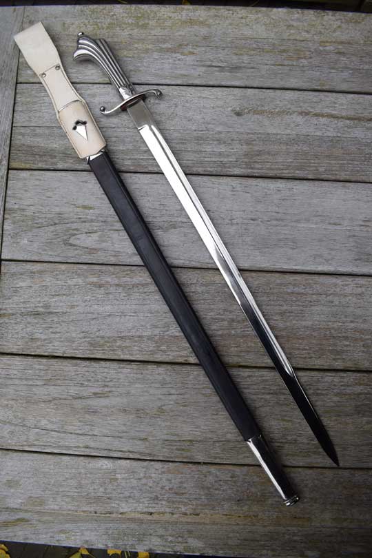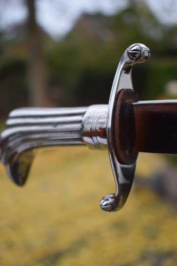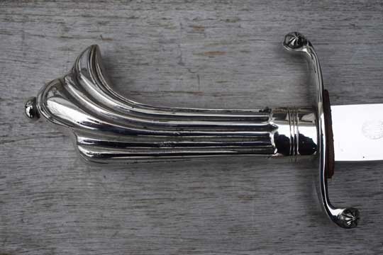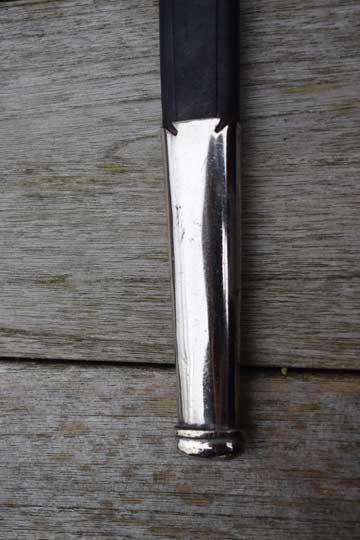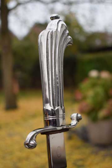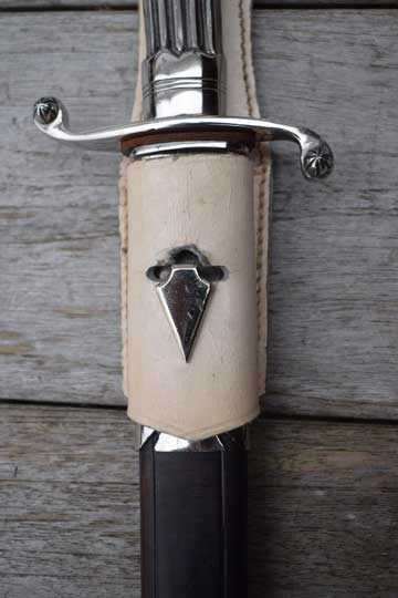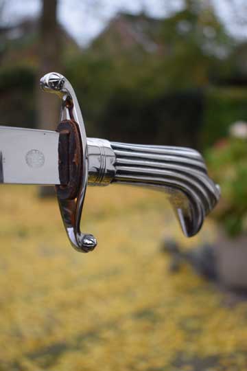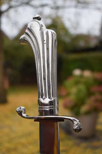 "Politie sabel van de Gemeente Politie Kapel, Amsterdam. ca. 1900". / Dutch Amsterdam Municipal Police bandsman short sword, around 1900. Superb straight bright finished fullered pointed blade. German maker's trademark of E. &. F. HÖRSTER - SOLINGEN on the ricasso. Leather washer intact. Excellent massive cast hilt with 6 fine ribs in Berlin-silver. Excellent Berlin-silver crossguard with two opposite quillons with flower motives finals. Excellent black leather scabbard with clear tooling. All stitches intact and the Berlin-silver mounts with no dents. Top mount with a triangle shaped frog stud.