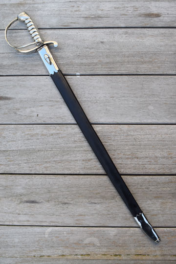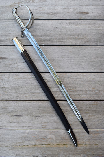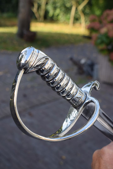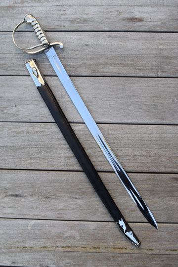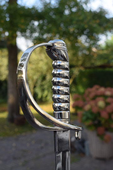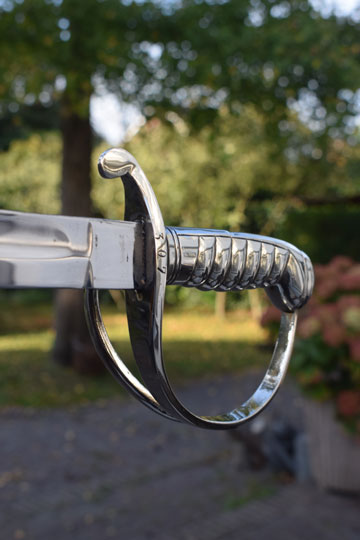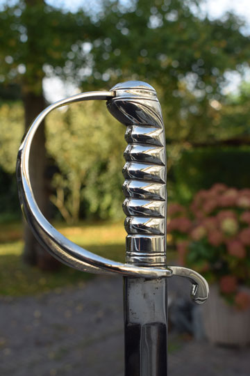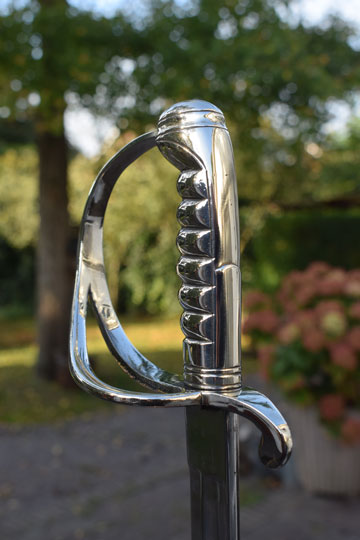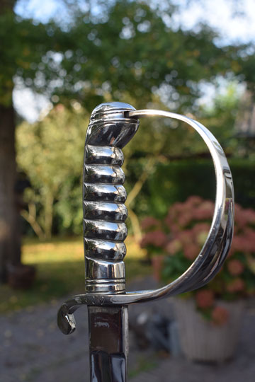 Excellent slightly curved bright finished fullered blade. Sharp tip, not blunted. Excellent masive Berlin- Silver grip with 6 ribs, a knucklebow and a single side bar. Crossguard with a swept forward quillon.