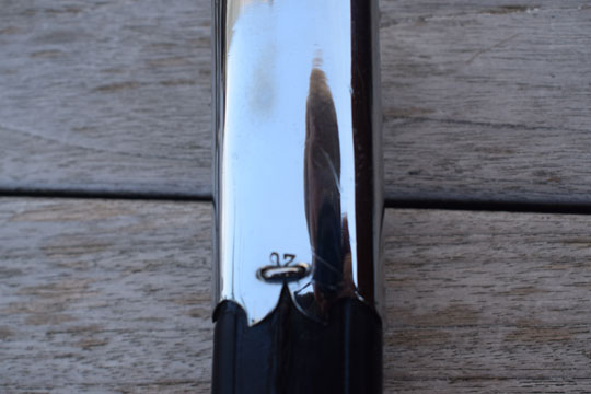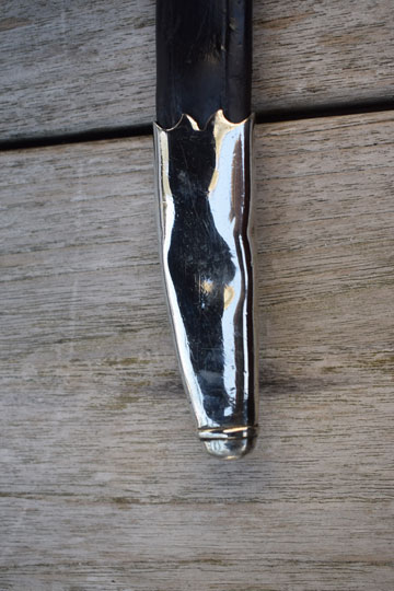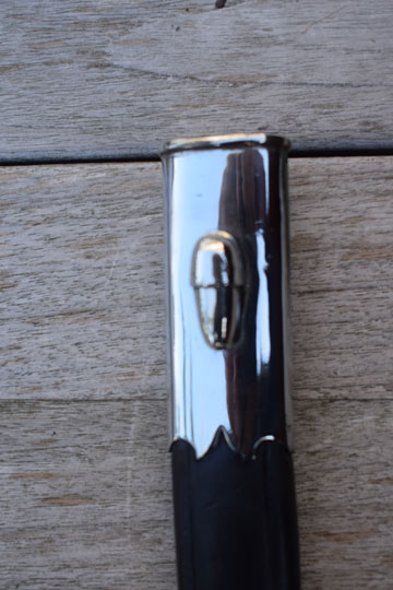 Excellent typical Dutch style tooled black leather scabbard. All stitches intact. Berlin - Silver top mount with an acorn shape frog stud and a Berlin - Silver chape with ball tip, both marked: 26. There is a very small dent to front of the chape only.