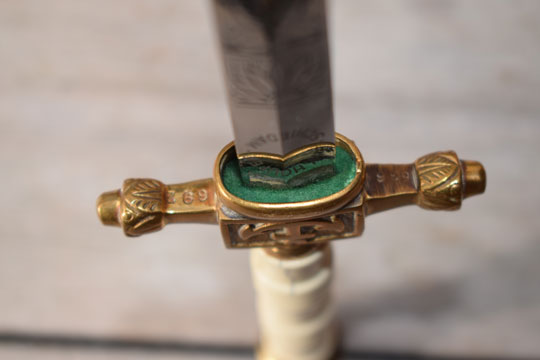 Service number 693 on blade front crossguard. This is an unique Dutch naval service number. This number gives acces to the name of the former owner.