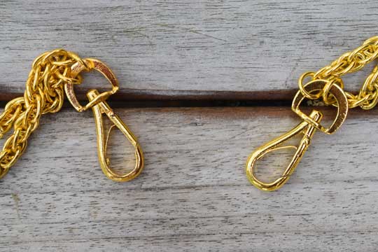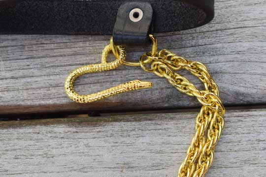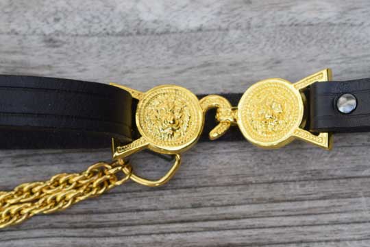It comes with its Minty gilt belt chain with hanging hook and its black leather belt with brass lion head buckle.