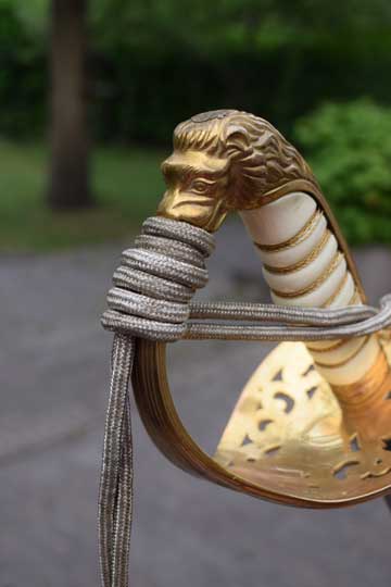 Nederlands marine officierssabel M 1882 "Sabel luitenant ter zee" / Dutch M 1882 naval officers sword. Excellent and beautiful bright finished heavy pipe back blade, etched in panels on both sides and on the blade spine. The panels have different motives. Both panels are showing a Man O'war and a fouled anchor under a crown. Blade is marked Yzerhouwer on one side and the German makers logo of Carl Eickhorn-Solingen, a sitting squirrel over C.E. in a double circle, on the reverse side. (This logo was used from 1933 till 1935). Felt washer intact. Gilt lion head hilt, the gilt handguard pierced with a fouled anchor under a crown and floral motives. The white ribbed composite grip is in an excellent condition and retains all the brass wire winding. Gilt mounted black leather scabbard in a perfect condition.
