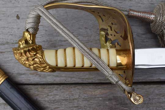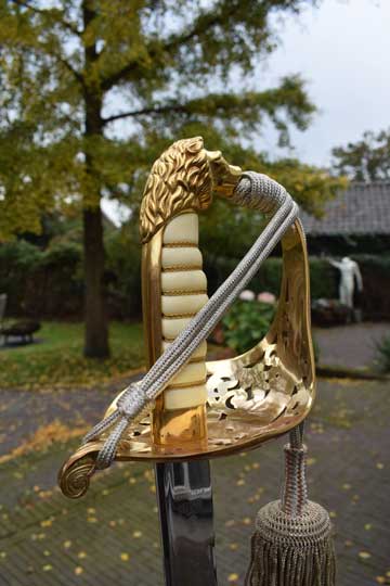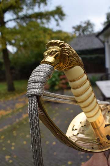 Etched blade is marked with the Dutch quality marking: YZERHOUWER and the German makers trademark: Knight helmet over WKC over SOLINGEN over GERMANY on the ricasso ( = Weyersberg-Kirschbaum & Co.-Solingen). Intact white leather washer. Gilt lion head hilt, the gilt hand guard pierced with a fouled anchor under a Royal crown and floral motives. Excellent ribbed white composite grip with an intact brass wire winding.