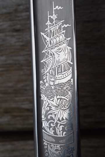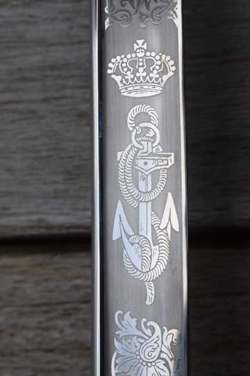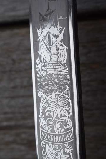 Nederlands marine officierssabel M 1882 "Sabel luitenant ter zee" / Dutch M 1882 naval officers sword. Minty and beautiful bright finished heavy pipe back blade, etched in panels on both sides and on the blade spine. The panels have different motives. One panel shows a Man O'war and a fouled anchor under a crown and the other panel shows a steamer and a fouled anchor under a crown.