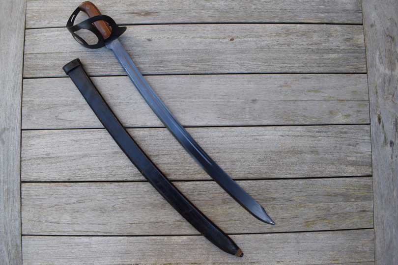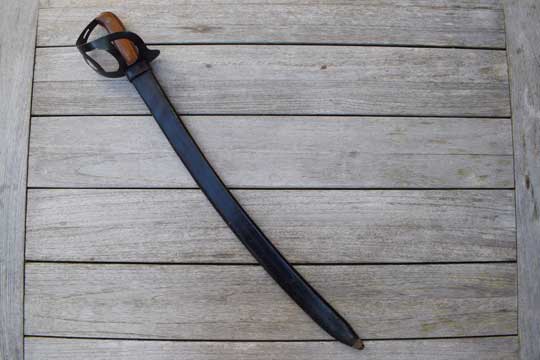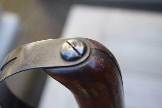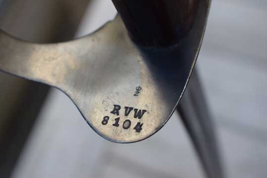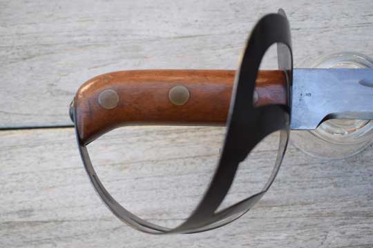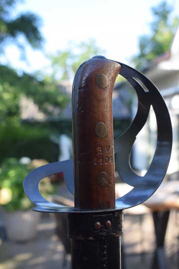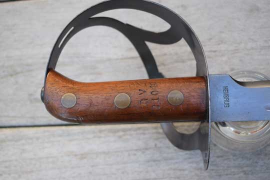 Excellent+ two piece wooden grip secured to the blade tang by three brass rivets. Left grip is marked: R V over 8104. Sword knot slit in the upper part of the guard.