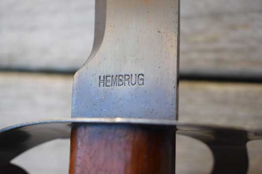 "Nederlands Politie (Rijks Veldwacht ) Klewang No.1. "/ Dutch Police (State Rural Constabulary) klewang/Cutlass No.1. Serial number: RVW over 8104 on the guard. Excellent++ deep blued fullered klewang blade with clip point. The ricasso is crisp marked with the Dutch makers name: HEMBRUG. A Dutch inspector marking Crown over Z. on the reverse ricasso. Excellent++ wide open blued steel hand guard. The detachable hilt is marked with a small Dutch inspection marking: Crown over Z.