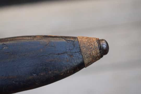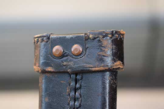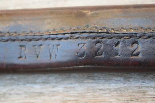 Excellent black leather scabbard. All stitches intact, and there is an internal retaining spring. Scabbard body is marked: RVW 3212 (= RIJKS VELD WACHT No. 3212) and throat is marked: RE. The klewang was carried with a Sam Browne belt. Therefore the carrying strap is cut away. Steel chape is fixed with by a tow winding.