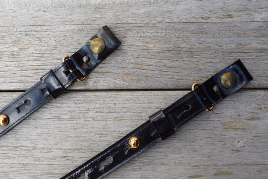 The set is complete with its genuine black patent leather carrying straps with brass buckles.