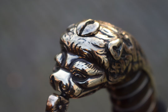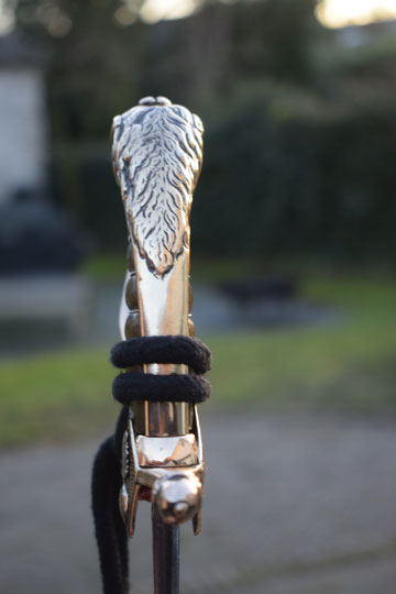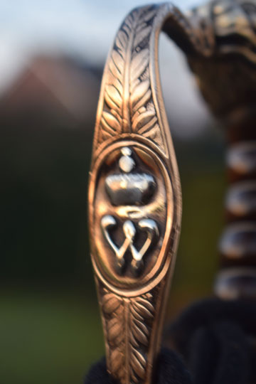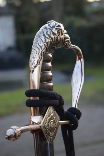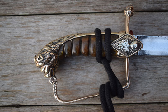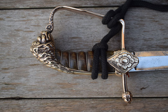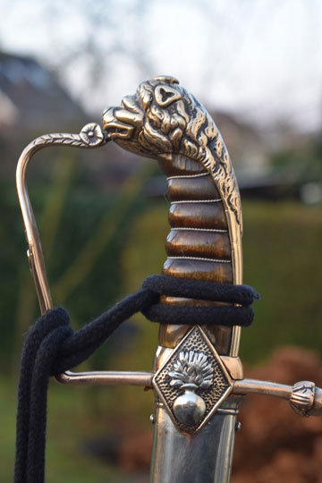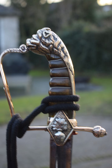 "Nederlandse Garde Grenadier Officiers sabel M 1852" / Dutch Grenadier Guard Officers sword M 1852. Excellent+ curved fullered bright finished blade. Left side of the blade is marked with the innitionals of the Dutch retailer: J.V.D.L. (= J. Van Der Laat - Amsterdam) and GARANTIE on the reverse side of the blade. Red washer intact. The hilt is detachable. there is a brass screw nut on top of the hilt. Beautiful large and massive brass lion head pommel. Brass single hand guard with King Willem III monogram under a Crown in silver. Brass crossguard with straight guillon and an achorn final. Two diamant shaped lanquets. Right side with flaming bomb in silver and the left lanquet with a flower motive. Excellent brown horn grip with an intact silver wire winding.