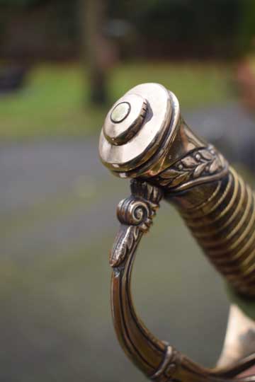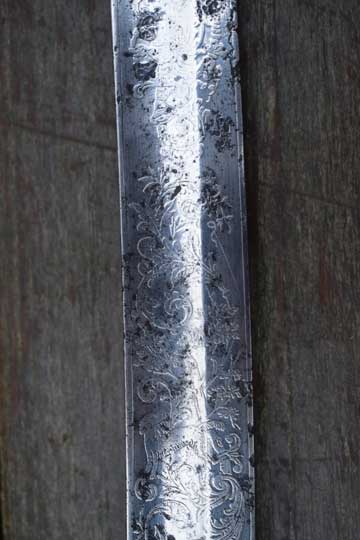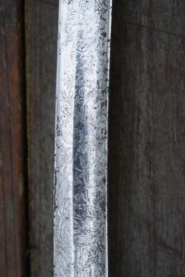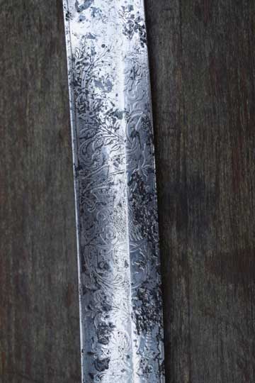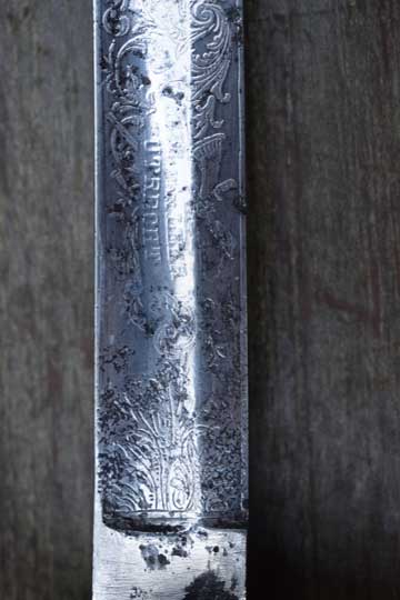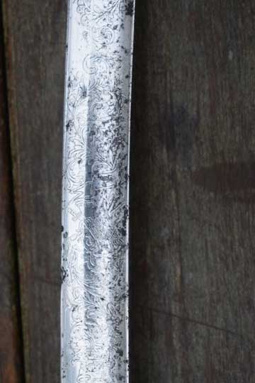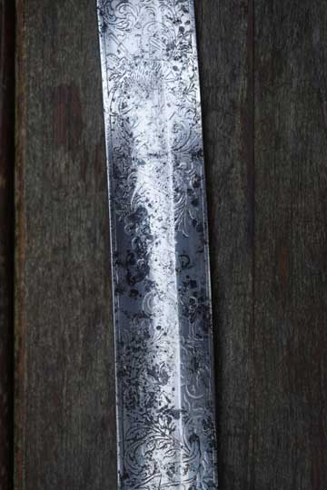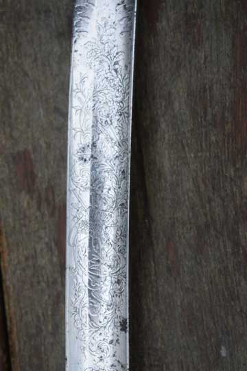 "Nederlands Garde Jager officiers sabel M 1852"/ Dutch M 1852 Jager Guard Officers sword. Very good+ very deep etched curved fullered heavy blade. Blade is beautiful deep etched on both sides with hunter's trofees, gun dogs and foliage. Right side of the blade with the Dutch retailers name and Residence: GEBR. VAN LEER - UTRECHT in a scroll. Blade spine is etched: REGIMENT GRENADIERS en JAGERS. Blade shows fine spots of corrosion and some spots of moderate pitting. Red felt washer intact. Excellent early type straight grip with a cast brass pommel and a beautiful one piece light marbled horn grip, complete with its intact brass wire winding. Excellent brass gilt hand guard with a single side bar. Crossguard with a forward swept guillon.
