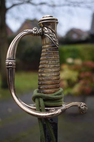 Comes with a very good and rare Jeager guard officers sword knot with a green cord, silver buillions and a red core.