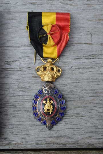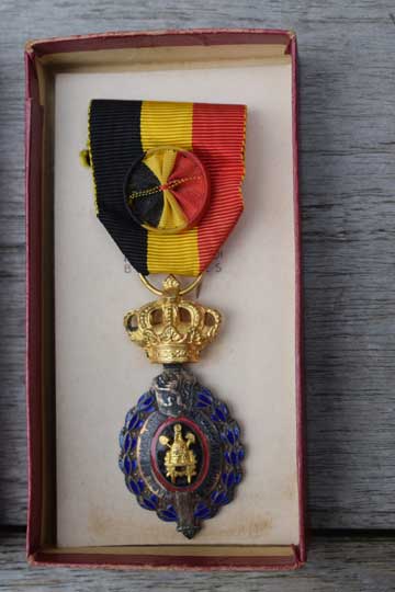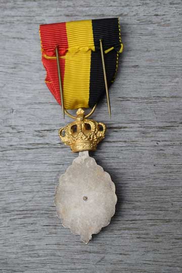 The medal is attached to a ribbon in the national colours of Belgium Black, Yellow and red showing a rosette in the same colours.