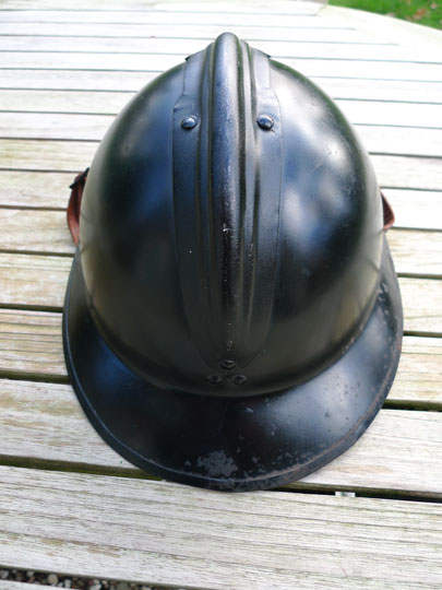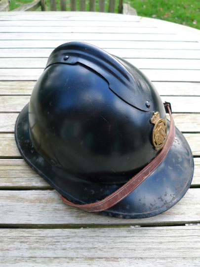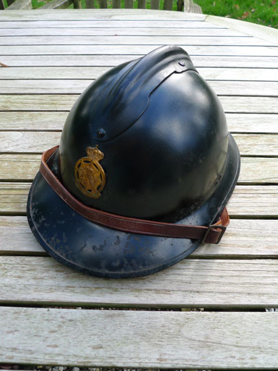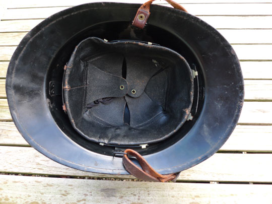 Belgium M 1933 Adrian helmet for the Home guard.( Civil defence.) Untouched black painted helmet with some light age spurs but no dents. Gold badge showing standing Knight with armor holding a shield. Belgium Home guard slogan IM PAVIDUM FERIENT RUINO underneath. Very good black leather liner and brown leather chin strap. A very nice to Excellent Belgium Home guard Adrian helmet used after WWI.