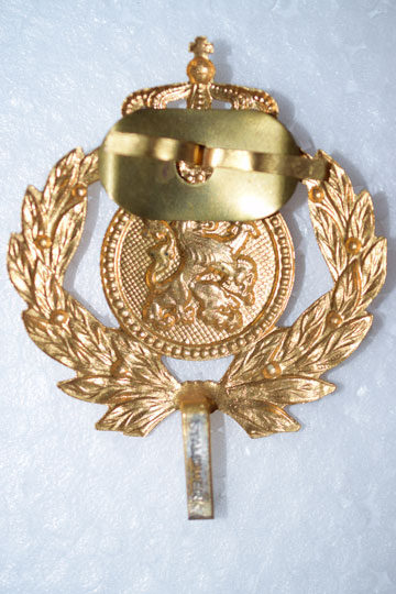Dutch Infantry officer's peaked cap emblem. Minty gilt emblem, showing the royal crown over a orange round badge with the Dutch rampant lion and a complete of a laurel wreath. This emblem is still in use for all ranks of Dutch infantry officers.
