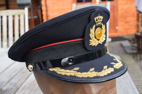Dutch ceremonial Officers visor cap for Artillery, Engineers, Grenadier and Jaeger field officers. Excellent dank blue fabric peaked officers cap. Dress uniform cap for the rank of colonel. Blue top and visor, red seemed black band with leather chin strap. Gilt washed infantry batch showing a Dutch rampant lion in an orange circle. Dutch royal crown in gold buillon wire work above and gilt laurels around the batch indicating a high rank officers cap. Visor with gold buillion wire work: oak leaves and acorns. Gilt button secured black chinstrap.